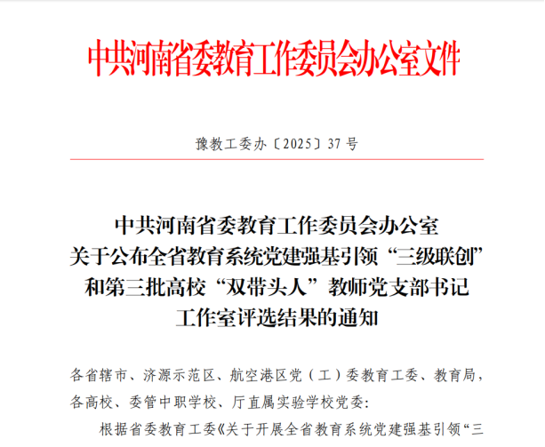 近日,省委教育工委印发《关于公布全省教育系统党建强基引领“三级联创”和第三批高校“双带头人”员工党支部书记工作室评选结果的通知》(豫教工委办〔2025〕37号),世俱杯买球官网网站党总支成功获评“全省高校党建工作标杆院系”培育创建单位。